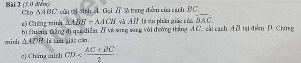 Cho AABC cân tại đỉnh A. Gọi H là trung điểm của cạnh BC.