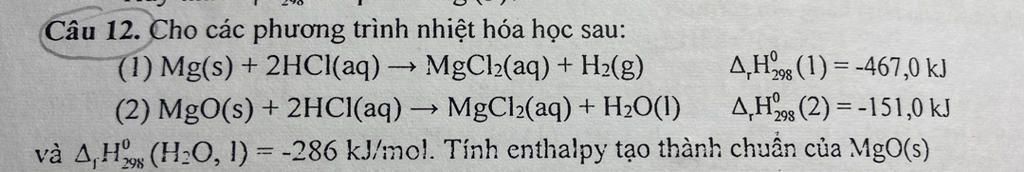 Có: $\Delta _rH^o_{298}(3)=\Delta _fH^o_{298}(MgO)-\Delta _fH^o_{298}(H_2O)$