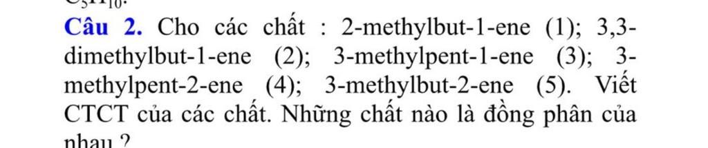 Câu 2. Cho các chất : 2-methylbut-1-ene