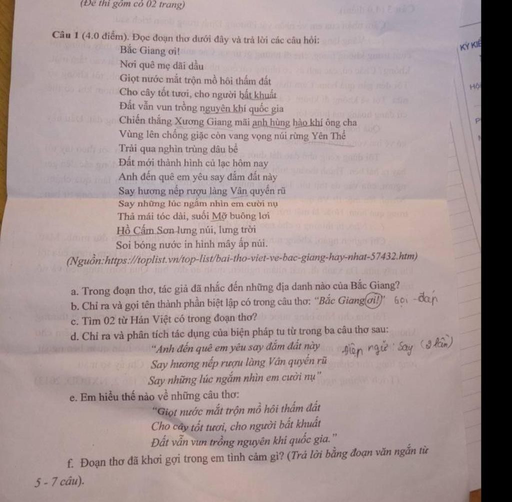 Những địa danh của Bắc Giang mà tác giả đã nhắc đến trong bài thơ: Xương Giang, Yên Thế, làng Vân, suối Mỡ, hồ Cấm Sơn.