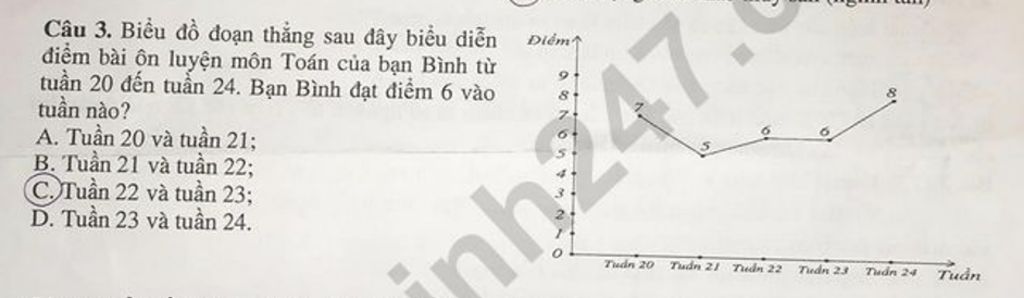 Câu 3. Biểu đồ đoạn thẳng sau đây biểu diễn điểm bài ôn luyện môn Toán của bạn Bình từ tuần 20 đến tuần 24. Bạn Bình đạt điểm 6 vào tuần nào?