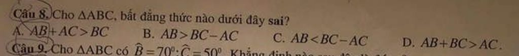 `@` Bất đẳng thức tam giác: trong `\triangleABC` thì: