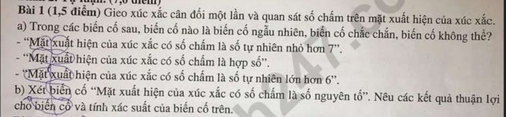 Ta thấy `:` Từ `1` đến `6` đều là số tự nhiên và bé hơn `7` nên đây là biến cố chắc chắn xảy ra