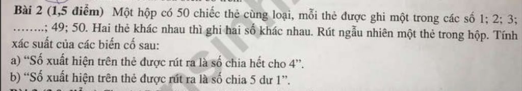 Vậy xác suất của biến cố '' Số xuất hiện trên thẻ được rút ra là số chia `5` dư `1` '' là `:`