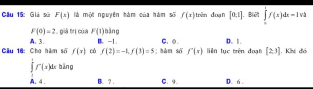 Câu 16: Cho hàm số f(x) có f(2)=−l,f(3)=5; hàm số f'(x) liên tục trên đoạn [2;3]. Khi đó