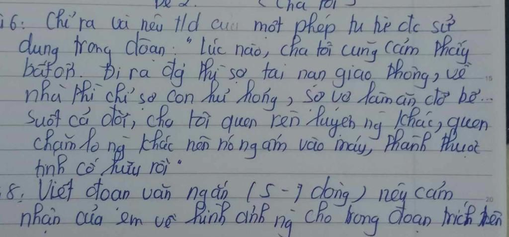 Câu 6: Phép tu từ được sử dụng là liệt kê.Tác dụng:Nhấn mạnh những lo lắng,bất an trong lòng người cha cùng với đó là thể hiện được người cha vô cùng chăm lo cho gia đình.