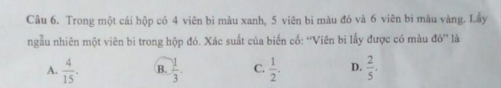 `=>` Xác suất của biến cố "viên bi lấy được có màu đỏ" là `1/3`