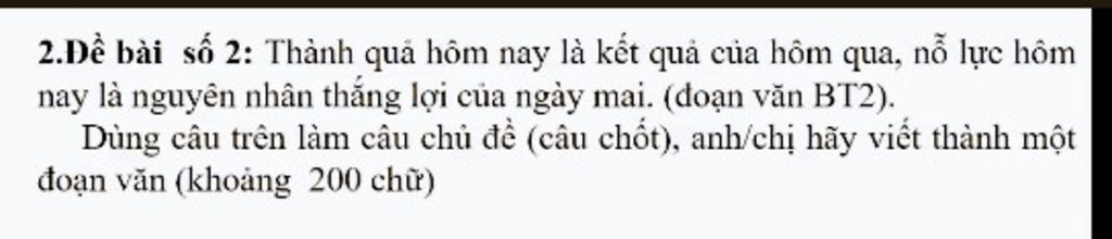 " Thành quả hôm nay là kết quả của ngày hôm qua, nỗ lực hôm nay là nguyên nhân thắng lợi của ngày mai" Đúng vậy muốn thành công đó là cả một quá trình rèn luyện kiên trì chứ không phải dễ dàng. Thành công hôm nay đó là kết quả của sự cố gắng ngày hôm qua của bạn. Chúng ta muốn ngày mai vui vẻ, hạnh phúc hay thành công thì đó chính là kết quả của ngyaf hôm qua chúng ta chuẩn bị . Sự chuẩn bị của hôm nay chính là kết quả của ngày hôm nay. Muốn hôm nay được điểm cao, thuộc bài thì hôm qua chúng ta phải học bài phải ôn tập. Thành công không tự dưng mà đến tất cả là do quá trình bạn chuẩn bị cho nó. Bất kể cuộc sống của bạn hiện nay như thế nào, bạn cũng không thể oán trách ai, cũng không thể phàn nàn về cuộc sống, và bạn càng không thể đổ lỗi cho xã hội bởi lẽ cuộc sống hôm nay nó phản ánh ngày hôm nay bạn đã cố gắng hay chưa mà thôi. Trong cuộc sống, ai cũng muốn mình thành công. Tuy nhiên, con đường đi đến thành công không phải dễ dàng . Con đường ấy không phải bằng phẳng mà đầy những chông gai thử thách ý chí của con người. Rất khó có thể định nghĩa được thành công, nhưng có một điều chắc chắn rằng để đạt được nó thì bạn sẽ phải nỗ lực hết sức mình, làm việc với tất cả khả năng và kết quả đem lại sẽ khiến bạn mỉm cười. Mỗi người có một cách để tìm thành công khác nhau, không ai giống ai cả. Nhưng trong sâu thẳm mỗi con người đó đều phải có những kỹ năng sau đây. Kiên trì và cố gắng chính là nguyên nhân của thắng lợi. Nhưng ở ngoài kia có không ít người không chịu cố gắng, nỗ lực cứ gặp khó khăn là chùn bước . Là một học sinh đang ngồi trên ghế nhà trường em sẽ cố gắng học tập thật tốt, nỗ lực cố gắng để thành công.