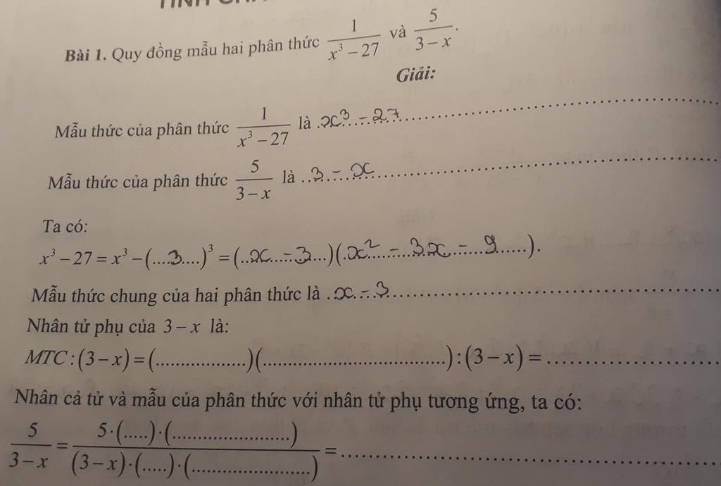 Mẫu thức chung của `2` đơn thức là : `(3-x)(x-3)(x^2 + 3x+9)`
