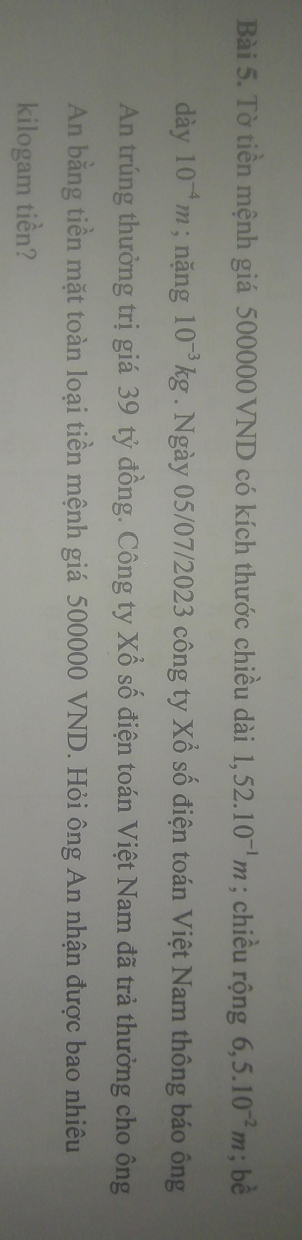 Bài 5. Tờ tiền mệnh giá 500000 VND có kích thước chiều dài 1,52.10-'m; chiều rộng 6,5.10m; bề