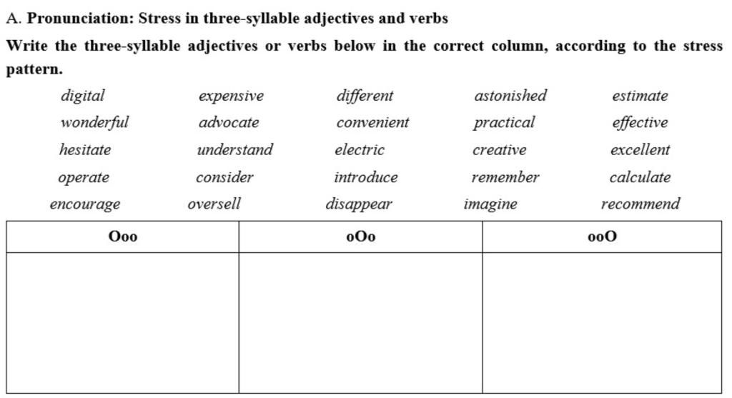 \begin{array}{|c|c|c|}\hline \text{Ooo}&\text{oOo }&\text{ooO }\\\hline \text{digital}&\text{expensive}&\text{understand}\\\hline \text{different}&\text{astonished}&\text{introduce}\\\hline \text{estimate}&\text{convenient}&\text{oversell}\\\hline \text{wonderful}&\text{effective}&\text{disappear}\\\hline\text{advocate}&\text{electric}&\text{recommend}\\\hline\text{practical}&\text{creative}&\text{X}\\\hline\text{hesitate}&\text{consider}&\text{X}\\\hline\text{excellent}&\text{remember}&\text{X}\\\hline\text{operate}&\text{encourage}&\text{X}\\\hline\text{calculate}&\text{imagine}&\text{X}\\\hline\end{array}