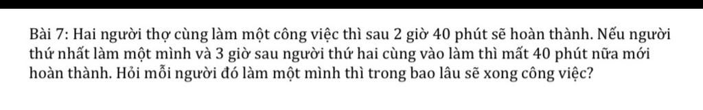 $\text{Người thứ nhất làm một mình 3 giờ rồi người thứ hai cùng làm }$`40` $\text{phút }$$\text{thì }$$\text{xong }$$\text{việc.}$