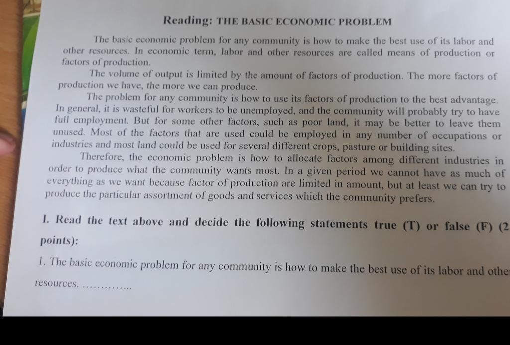 `->` Câu đầu tiên của bài: "The basic economic problem for any community is how to make the best use of its labor and other resources. "