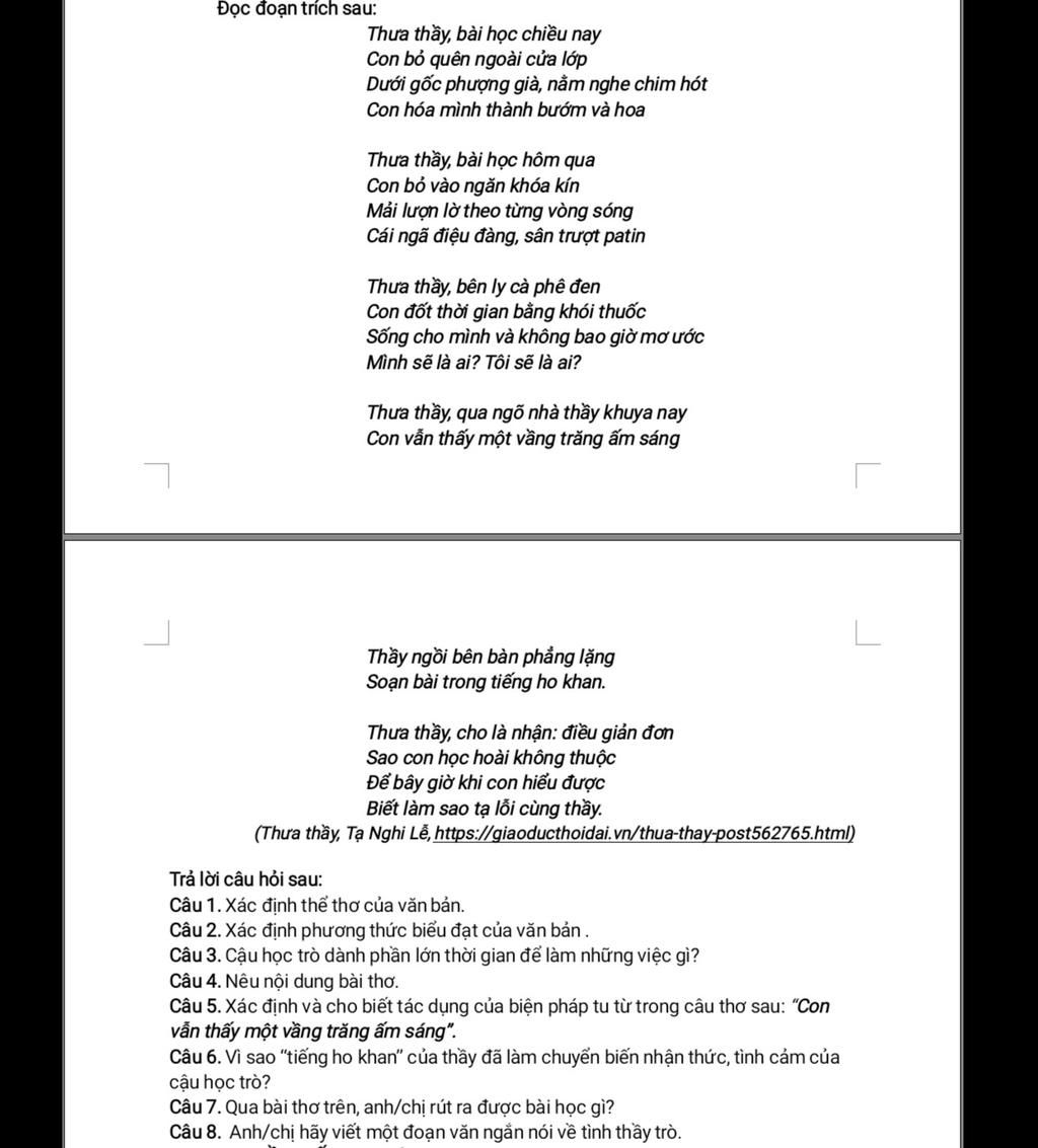 4. Nội dung của bài thơ là lời tâm tình, bộc bạch chân thành của người học trò về những bài học thầy từng dạy, triết lý cuộc sống và những kỷ niệm xưa