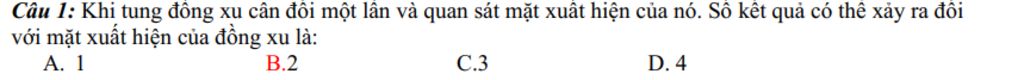 $-$ Vì đồng xu có hai mặt là sấp và ngửa nên khi tung đồng xu số kết quả có thể xảy ra đối với mặt xuất hiện của đồng xu là `2`
