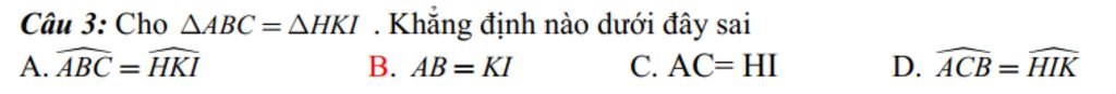 `B.` Sai vì `AB=HK` (Hai cạnh tương ứng) chứ không phải `AB=KI`