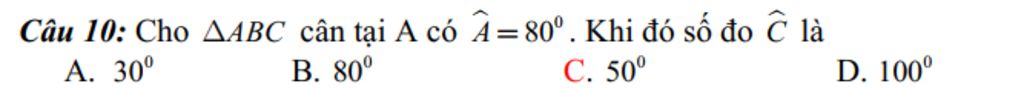 `=>hat{B}=hat{C}=(180^o - hat{A})/2=(180^o -80^o)/2=50^o`