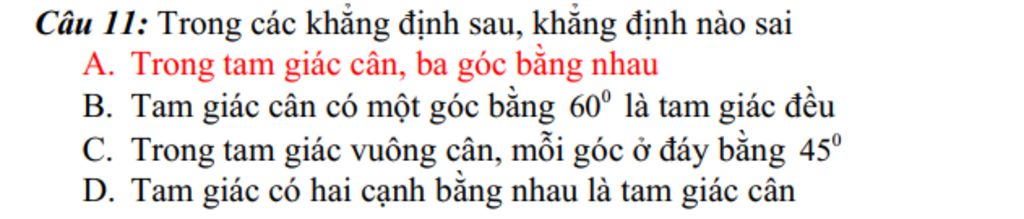 `A.` Sai vì trong tam giác cân, hai góc tại đáy bằng nhau.