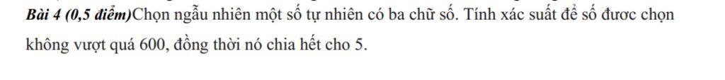 Vậy, xác suất để số được chọn không vượt quá 600, đồng thời nó chia hết cho 5 là:`101/900`