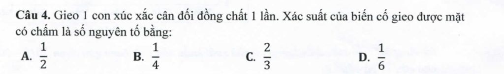 Xác suất của biến cố gieo được mặt có chấm là số nguyên tố bằng `1/2`
