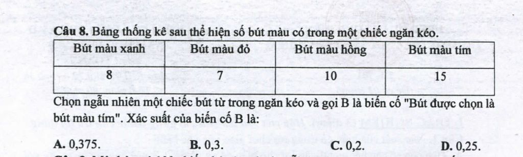 Xác xuất của biến cố "Bút được chọn là bút màu tím" là: