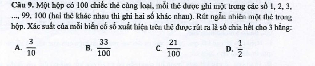 Xác suất của mỗi biến cố số xuất hiện trên thẻ được rút ra là số chia hết cho 3 bằng: `33/100`