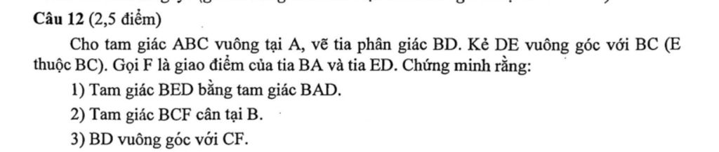 Cho tam giác ABC vuông tại A, vẽ tia phân giác BD. Kẻ DE vuông góc với BC (E thuộc BC). Gọi F là giao điểm của tia BA và tia ED. Chứng minh rằng: