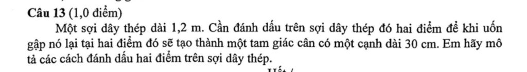 Một sợi dây thép dài 1,2 m. Cần đánh dấu trên sợi dây thép đó hai điểm để khi uốn gập nó lại tại hai điểm đó sẽ tạo thành một tam giác cân có một cạnh dài 30 cm. Em hãy mô tả các cách đánh dấu hai điểm trên sợi dây thép.