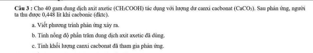 Giải thích các bước giải:PTHH:CH3COOH+CaCO3------>CH3COOCa+H2O+CO2