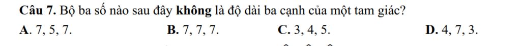 `@` Có: `7cm+3cm=10cm` mà `10cm > 4cm`