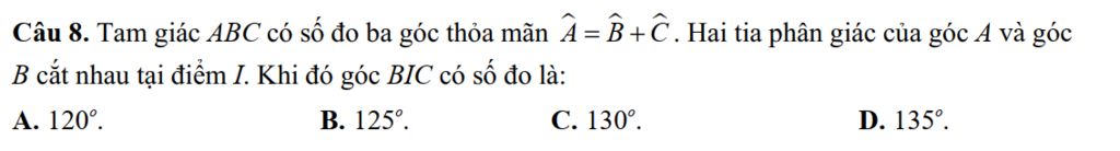 ->`D`$\\$Xét`\triangle``ABC, ta có: $\\$`A=B+C` mà A+B+C=180^0`$\\$`->``2A=180^0`$\\$`=>` B+C=90^0`$\\$Mặt khác, I là giao của 3 đường phân giác trong`\triangle` ABC`$\\$`=> IC cũng là đường phân giác góc C của`\triangle`` ABC`$\\$`BIC=180^0-(B/2+C/2)`$\\$`=180^0-1/2(B+C)`$\\$`=180^0-1/2xx90^0` $\\$`=180^0-45^0=135^0`