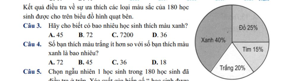 Số bạn thích màu xanh `: 180 . 40% = 72` ( em )