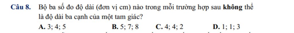 `A. {(3+4>5),(3+5>4),(4+5>3):}->` Loại