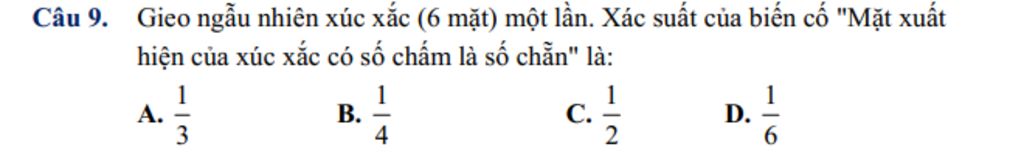 Xác suất của biến cố "Mặt xuất hiện của xúc xắc có số chấm là số chẵn" là: `1/2`