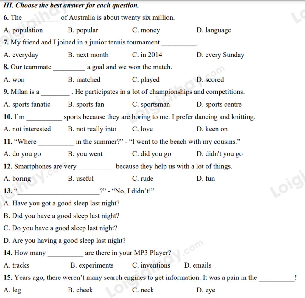 10. I’m __________ sports because they are boring to me. I prefer dancing and knitting.