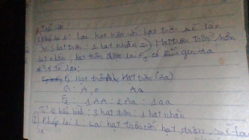 Xét phép lai 2: Hạt trơn F1 Aa lai hạt trơn tạo ra 100% hạt trơn => Cây hạt trơn đem lai có kiểu gen AA