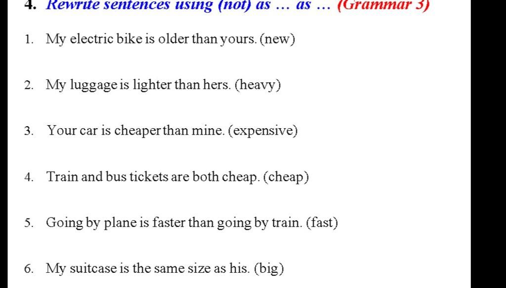 1. My electric bike is not as new as yours. 2.My luggage is not as heavy as hers. 3.Your car is not as expensive as mine. 4. Train tickets are as cheap as bus tickets. 5.Going by train is not as fast as going by plane. 6. My suicase is as big as his. Nếu thấy hay nhớ vote 5 sao cho tớ nhaa Rút gọn1. My electric bike is not as new as yours. 2.My luggage is not as heavy as hers. 3.Your car is not as expensive as mine. 4. Train tickets are as cheap as bus tickets. 5.Going by train is not as fast as going by plane. 6. My suicase is as big as his. N... xem thêm
