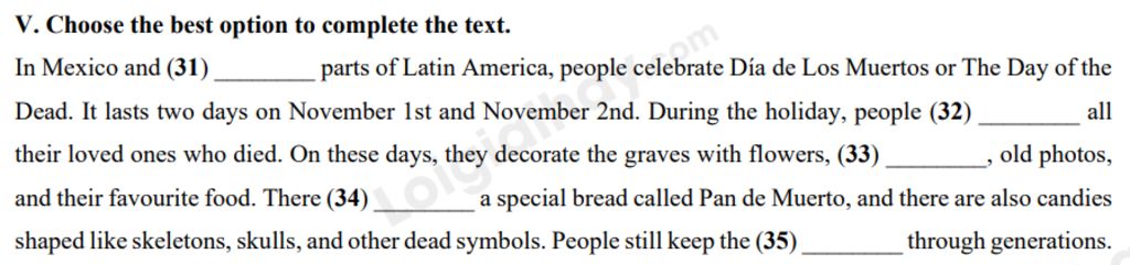 In Mexico and (31) ________ parts of Latin America, people celebrate Día de Los Muertos or The Day of the Dead. It lasts two days on November 1st and November 2nd. During the holiday, people (32) ________ all their loved ones who died. On these days, they decorate the graves with flowers, (33) ________, old photos, and their favourite food. There (34) ________ a pecial bread called Pan de Muerto, and there are also candies shaped like skeletons, skulls, and other dead symbols. People still keep the (35) ________ through generations.