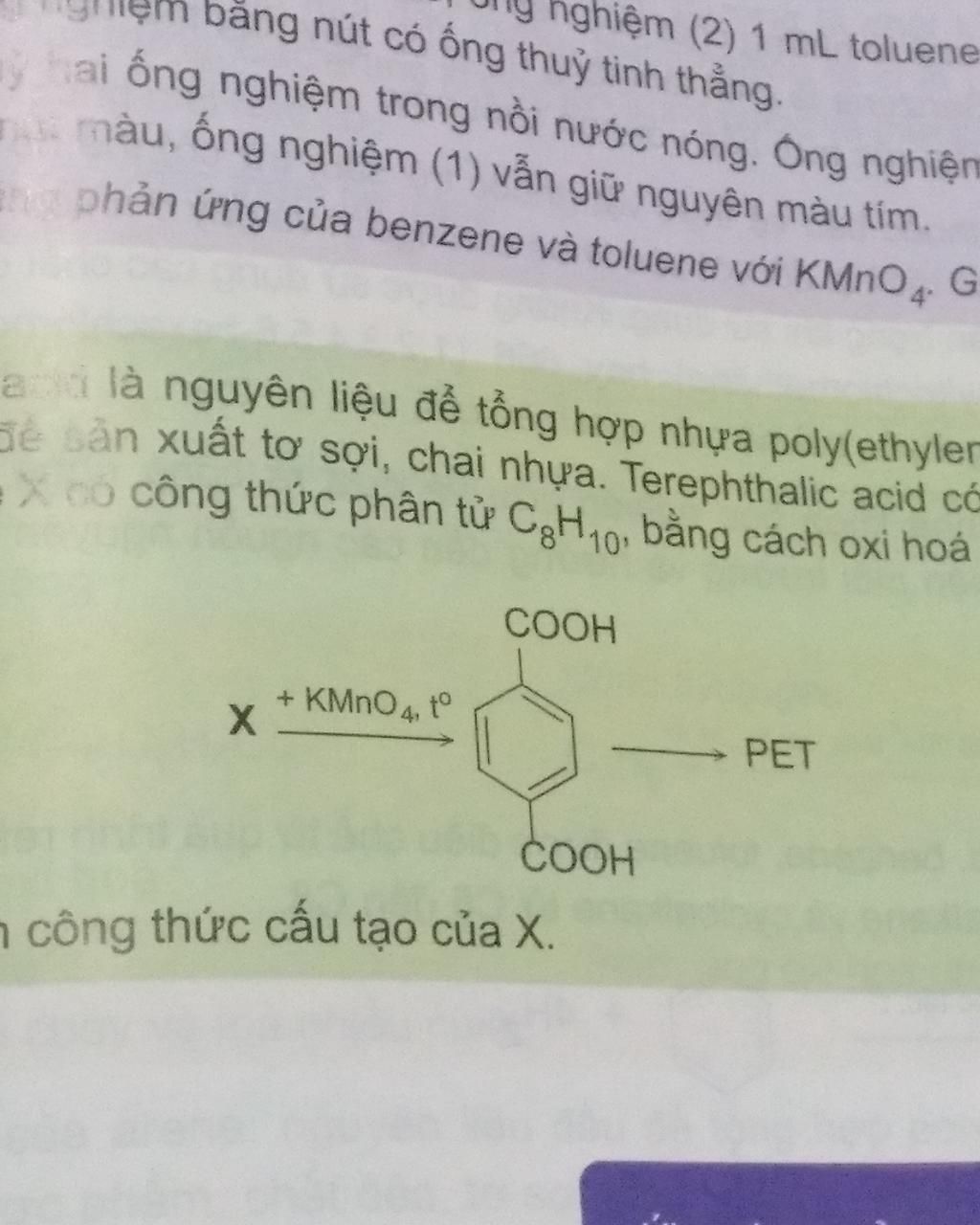 Terephthalic acid là nguyên liệu để tổng hợp nhựa poly(ethylene terephtalate) (PET) dùng để sản xuất tơ sợi, chai nhựa. Terephthalic acid có thể được tổng hợp từ arene X có công thức phân tử C8H10, bằng cách oxi hoá X bởi dung dịch thuốc tím: