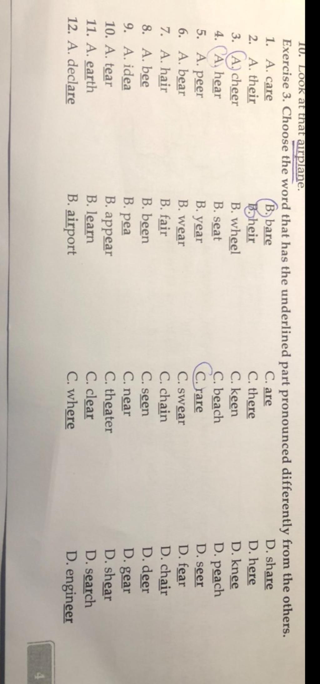 Exercise 3. Choose the word that has the underlined part pronounced differently from the others.