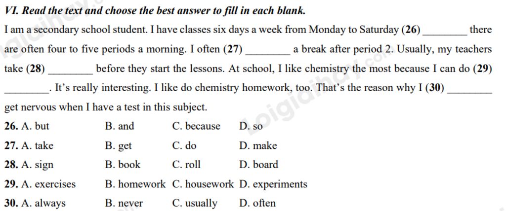 I am a secondary school student. I have classes six days a week from Monday to Saturday (26) ________ there are often four to five periods a morning. I often (27) ________ a break after period 2. Usually, my teachers take (28) ________ before they start the lessons. At school, I like chemistry the most because I can do (29) ________. It’s really interesting. I like do chemistry homework, too. That’s the reason why I (30) ________ get nervous when I have a test in this subject.