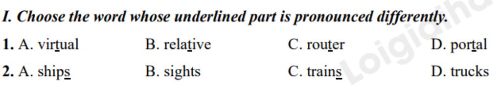 I. Choose the word whose underlined part is pronounced differently.