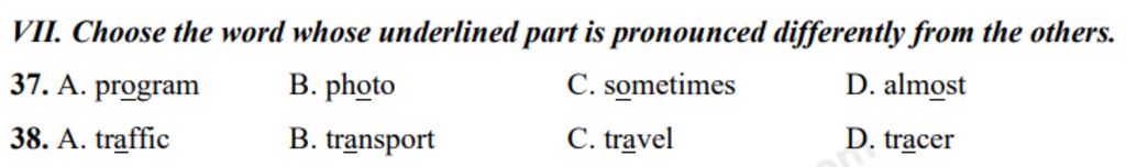 VII. Choose the word whose underlined part is pronounced differently from the others.