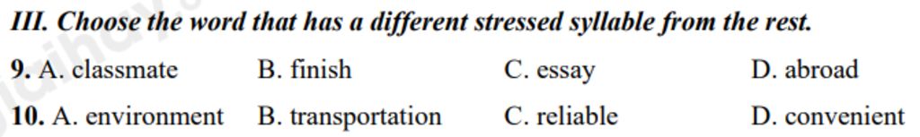 9. A. classmate B. finish C. essay D. abroad