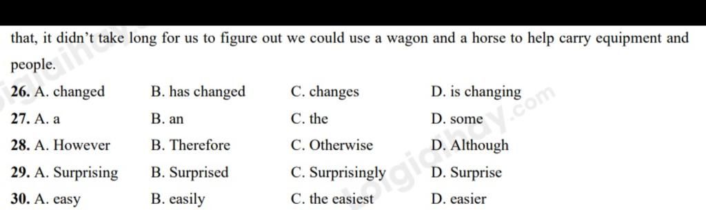 Transportation (26) __________ in many ways over the years. The oldest known form of transportation is (27) __________ boat. Around 60,000 years ago, boats were made by hollowing out a tree trunk, also known as a canoe. Riders had to use paddles to control the canoe across the water. (28) __________, today boats are more convenient because they have an engine that powers them. Next came horses. (29) __________, it took 55,000 years after the invention of the boat to discover horses as a means of transportation. At first, horses were ridden without a saddle, also called riding bareback. But over time, riders used saddles to make traveling more comfortable and (30) __________ to control the horse. After that, it didnt take long for us to figure out we could use a wagon and a horse to help carry equipment and people.