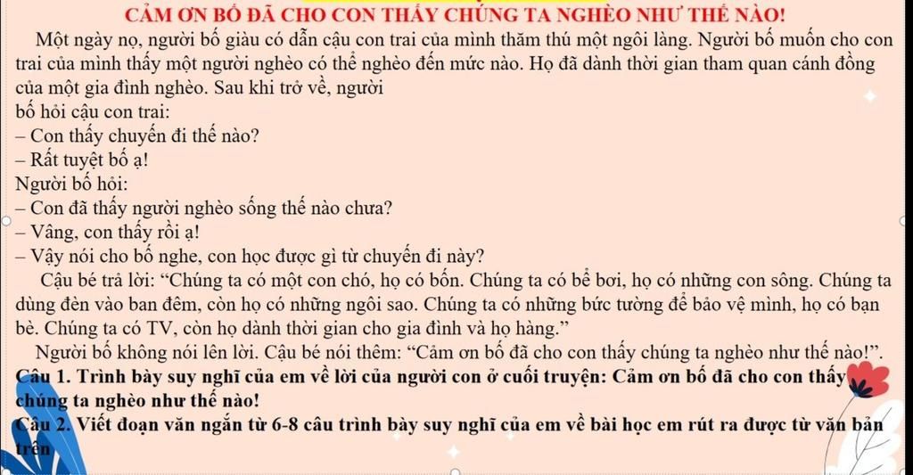 1. Lời của người con ở cuối truyện đã cho thấy được sự nhận thức của người con về sự giàu có hay nghèo khổ của cuộc sống ở một góc nhìn khác, quan điểm khác. Dù xét về vật chất, gia đình của người con giàu có, nhưng nếu nhìn ở một góc nhìn khác thì những người nông dân ở ngôi làng cũng không hề nghèo khổ mà họ có những giá trị vật chất và tinh thần vô giá