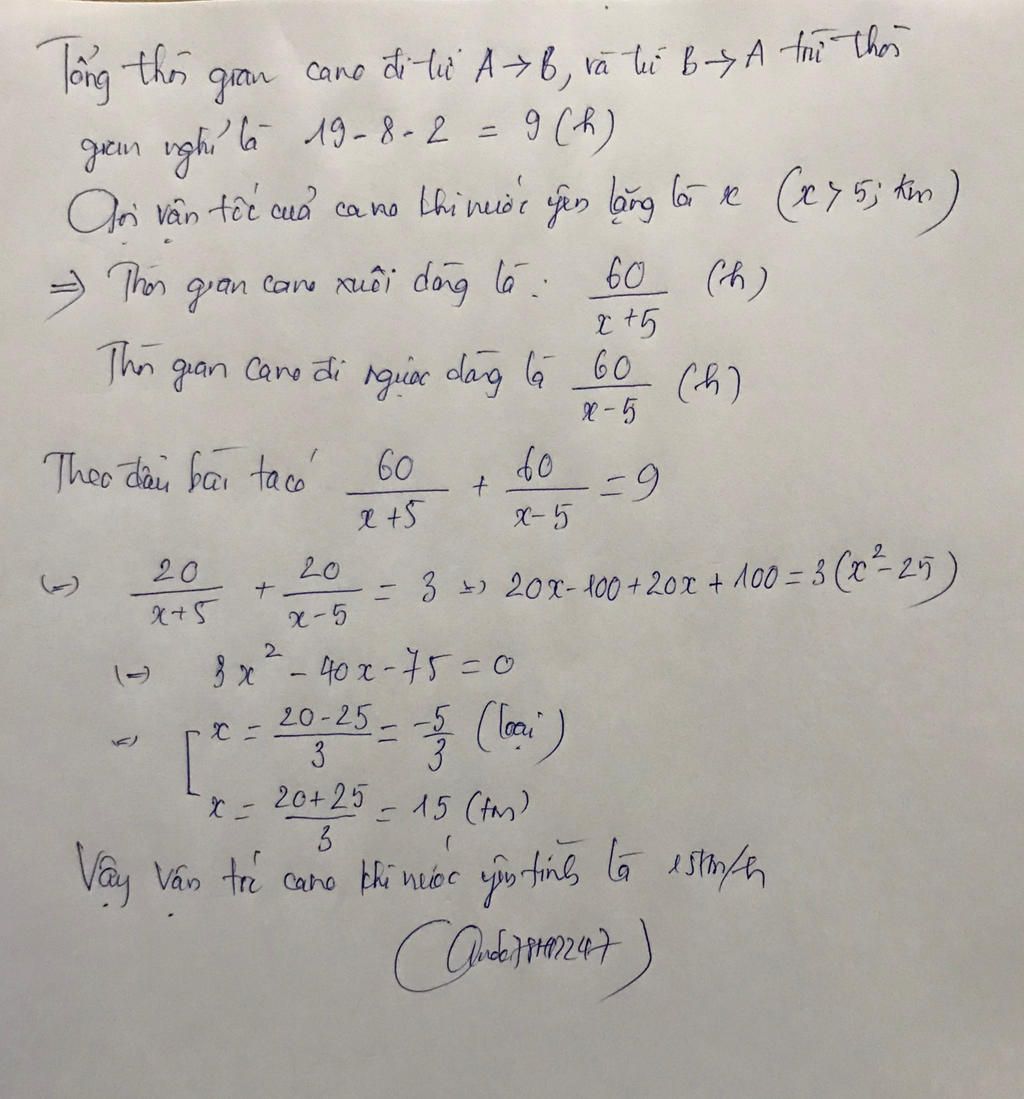 hai bến sông a và b cách nhau 60km. Lúc 8h sáng một cano xuôi dòng từ A đến B. Tại B cano nghỉ 2h rồi ngược dòng từ B về A. Cano trở về đến bến A lúc 19h cùng ngày. Tính vận tốc của cano khi nước yên lặng, biết vận tốc của dòng nước là 5km/h