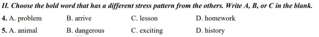 II. Choose the bold word that has a different stress pattern from the others. Write A, B, or C in the blank.