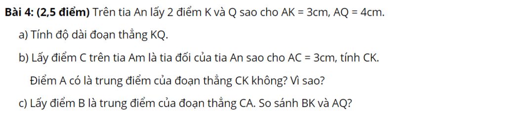 Bài 4: (2,5 điểm) Trên tia An lấy 2 điểm K và Q sao cho AK = 3cm, AQ = 4cm.