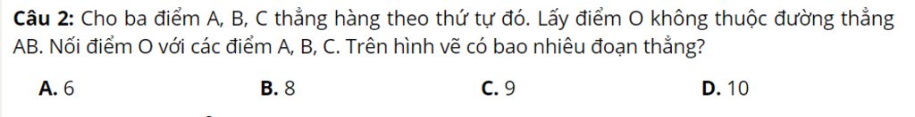 Câu 2: Cho ba điểm A, B, C thẳng hàng theo thứ tự đó. Lấy điểm O không thuộc đường thẳng AB. Nối điểm O với các điểm A, B, C. Trên hình vẽ có bao nhiêu đoạn thẳng?
